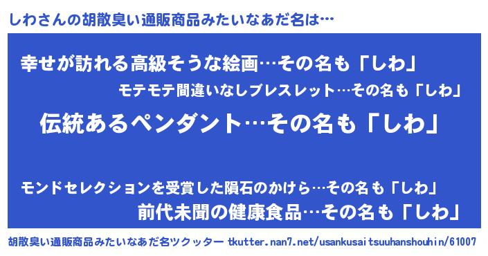 | ヒーロー風カッコイイあだ名 | 『幻影騎士シワ』『ウルトラしわマン』 |