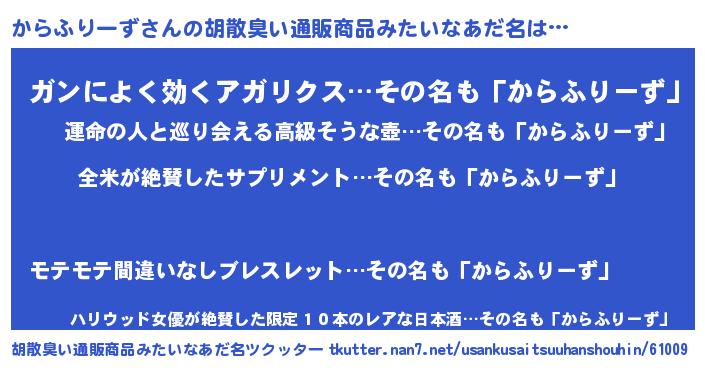 | 男性向けラノベタイトル風あだ名 | 『からふりーずの嫁は女の子じゃないと思った?』 |
