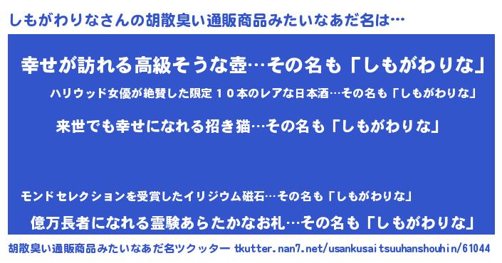 | ヘコむあだ名 | 『しもがわりな(笑)』『酢こんぶ』 |