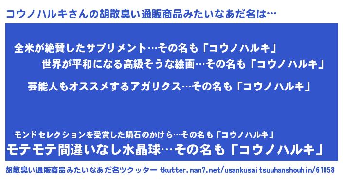 | 意味不明あだ名 | 『自称コウノハルキ』 |