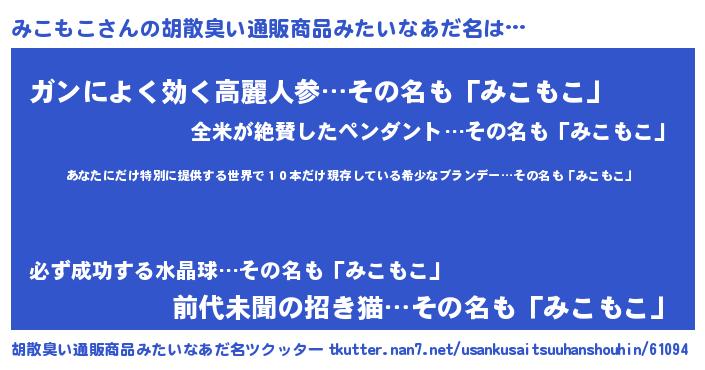 | 男性向けラノベタイトル風あだ名 | 『この素晴らしい世界にみこもこを!』 |
