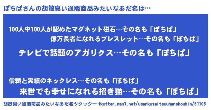 | 意味不明あだ名 | 『自称ぽちぱ』『なめこ科ぽちぱ属』 |