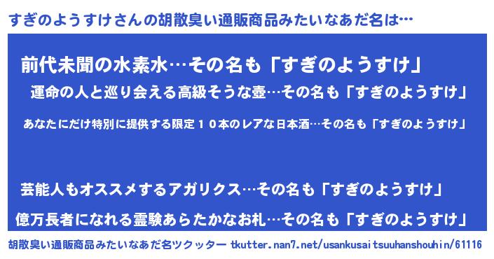 | 意味不明あだ名 | 『住所不定無職すぎのようすけ(50歳)』 |