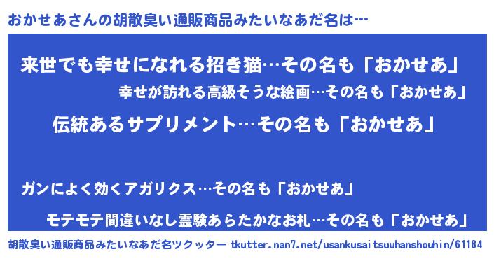 | 男性向けラノベタイトル風あだ名 | 『転生したらおかせあだった件』 |