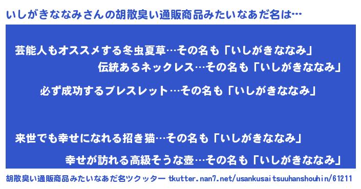| 男性向けラノベタイトル風あだ名 | 『いしがきななみの憂鬱』 |