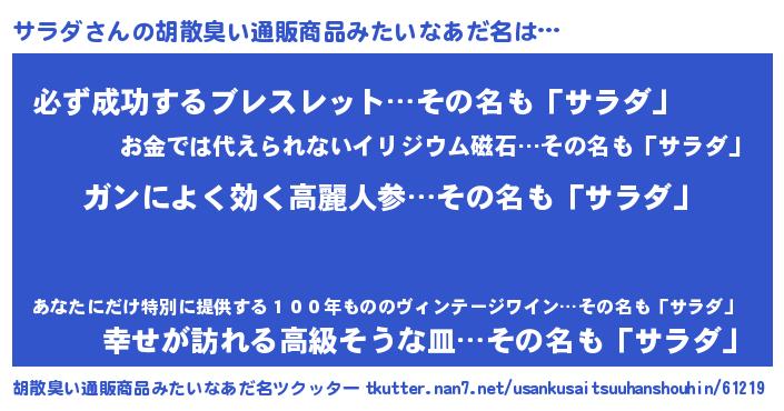 | 男性向けラノベタイトル風あだ名 | 『緋弾のサラダ』『魔法科高校のサラダ』 |