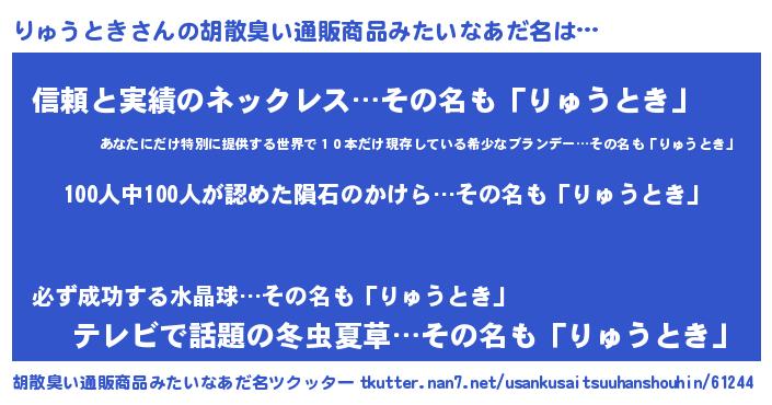 | 男性向けラノベタイトル風あだ名 | 『おまえをオタクにしてやるから、俺をりゅうときにしてくれ! 』 |