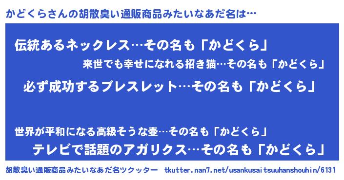 | 男性向けラノベタイトル風あだ名 | 『かどくらの憂鬱』 |