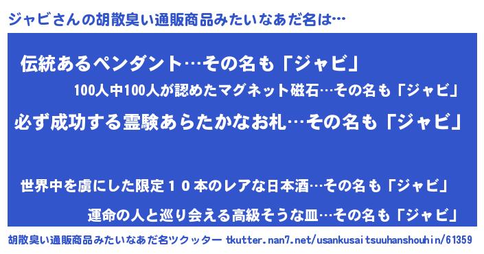 | 男性向けラノベタイトル風あだ名 | 『緋弾のジャビ』『はたらくジャビさま!』 |