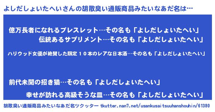 | 意味不明あだ名 | 『住所不定無職よしだしょいたへい(59歳)』 |
