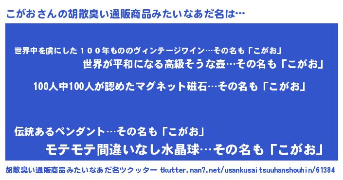 | ヘコむあだ名 | 『こがふぇ~』『なまこ酢』『こがお』 |