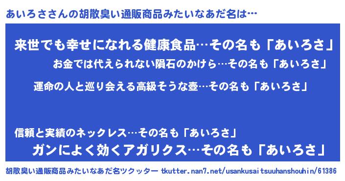 | 意味不明あだ名 | 『あいろさフォーエバー』『自称あいろさ』 |