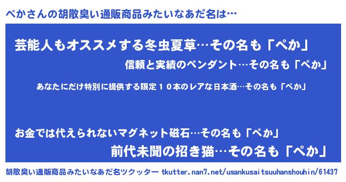 | 意味不明あだ名 | 『住所不定無職ぺか(62歳)』『ニラ科ぺか属』 |