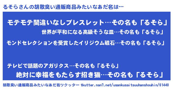 | 男性向けラノベタイトル風あだ名 | 『るそらに滅ぼされるだけの簡単なお仕事です』 |