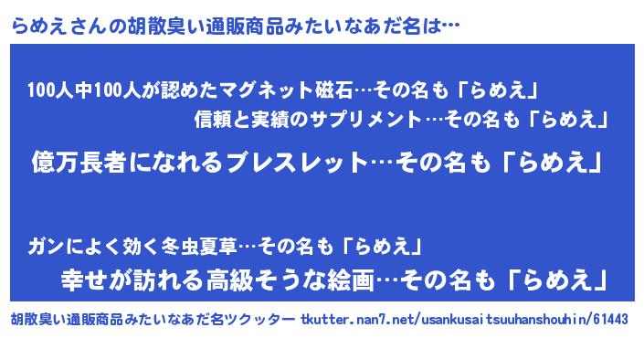 | ヘコむあだ名 | 『らめにー』『豆乳』『らめを』 |