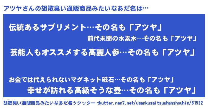 | 女子向けラノベタイトル風あだ名 | 『闇のアツヤ』『アツヤの卵を拾いまして』 |