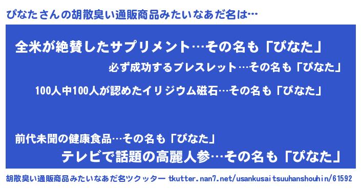 | 女子向けラノベタイトル風あだ名 | 『ぴなた夫妻のなれそめ』『闇のぴなた』 |