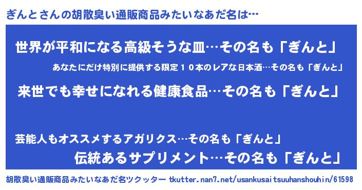 | 男性向けラノベタイトル風あだ名 | 『ぎんとという概念が存在しない退屈な世界 』 |