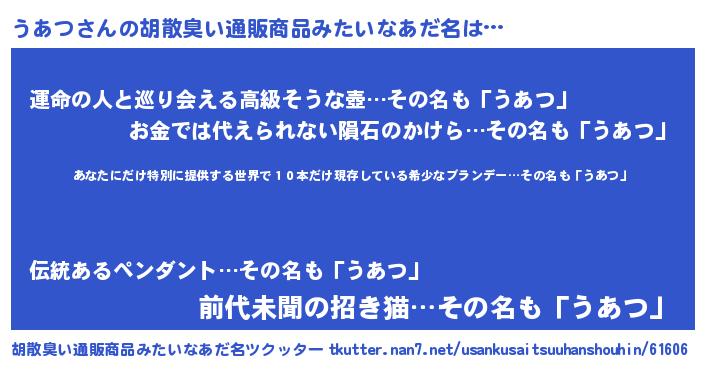 | 男性向けラノベタイトル風あだ名 | 『うあつに滅ぼされるだけの簡単なお仕事です』 |