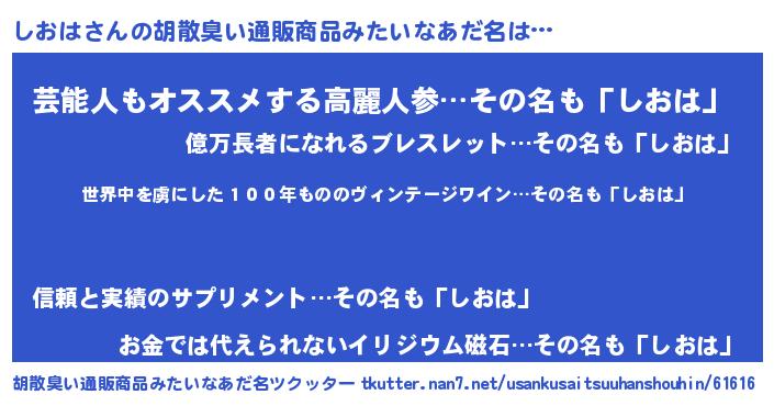 | ヘコむあだ名 | 『しおにー』『しおお』『なまこ酢』 |