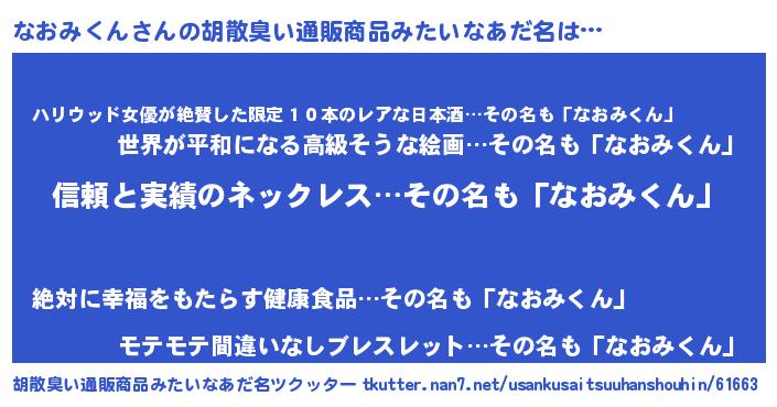 | 男性向けラノベタイトル風あだ名 | 『ダンジョンになおみくんを求めるのは間違っているだろうか』 |
