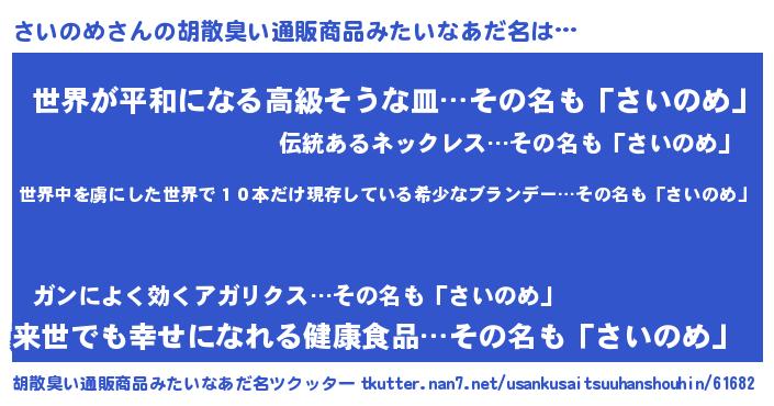 | 意味不明あだ名 | 『住所不定無職さいのめ(84歳)』 |
