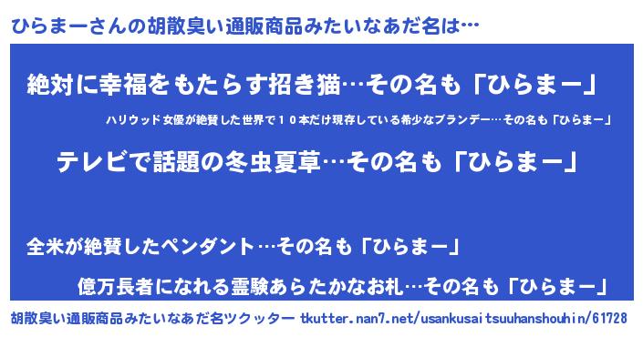 | 男性向けラノベタイトル風あだ名 | 『Re:ひらまーから始める異世界生活』 |