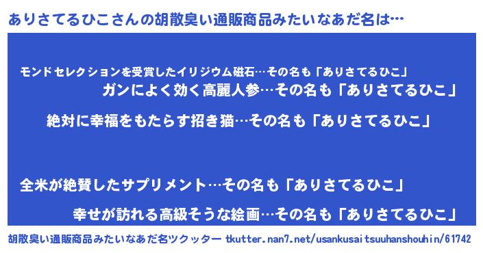 | ヘコむあだ名 | 『ありさてるひこ(小並感)』『酢こんぶ』 |