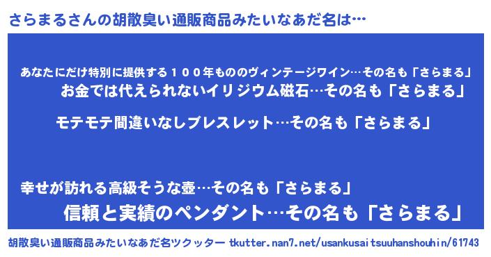 | 男性向けラノベタイトル風あだ名 | 『転生したらさらまるだった件』 |