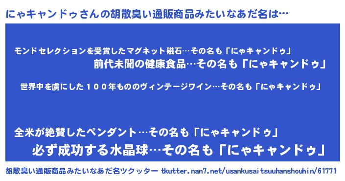 | 意味不明あだ名 | 『住所不定無職にゃキャンドゥ(3歳)』 |