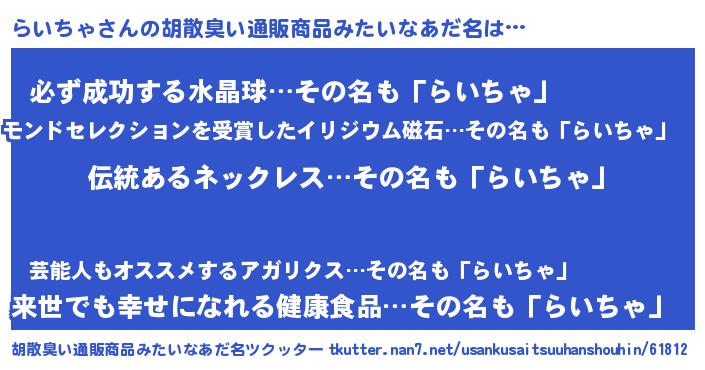 | 肩書あだ名 | 『らいちゃ塾長』『らいちゃ少尉』 |