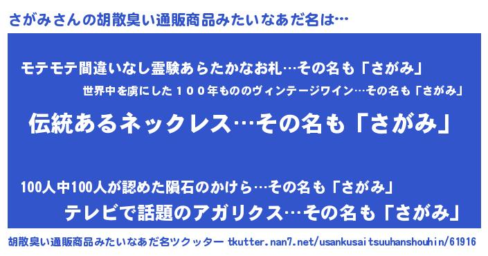 | 意味不明あだ名 | 『とにかく怪しいさがみ』『自称さがみ』 |