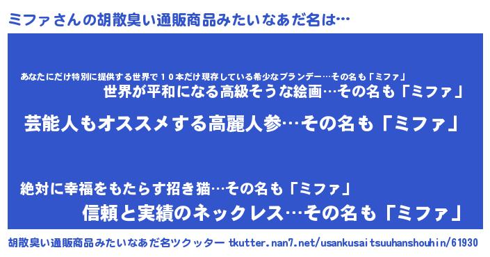 | ヘコむあだ名 | 『ミフを』『豆乳』『ミファ(苦笑)』 |