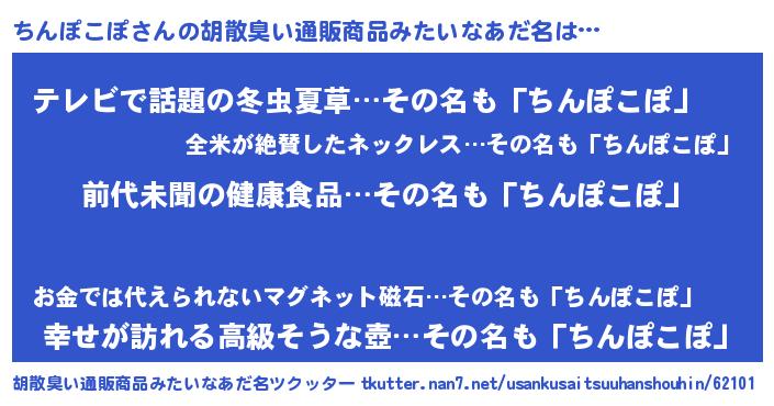 | 男性向けラノベタイトル風あだ名 | 『ちんぽこぽ~年齢イコール彼女いない歴の魔法使い~』 |