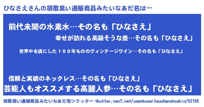 | 意味不明あだ名 | 『住所不定無職ひなさえ(2歳)』 |