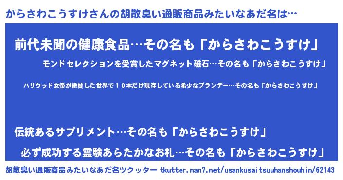 | ヘコむあだ名 | 『からさわこうすけ(苦笑)』『からにゅー』 |