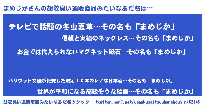 | 男性向けラノベタイトル風あだ名 | 『おまえをオタクにしてやるから、俺をまめじかにしてくれ! 』 |