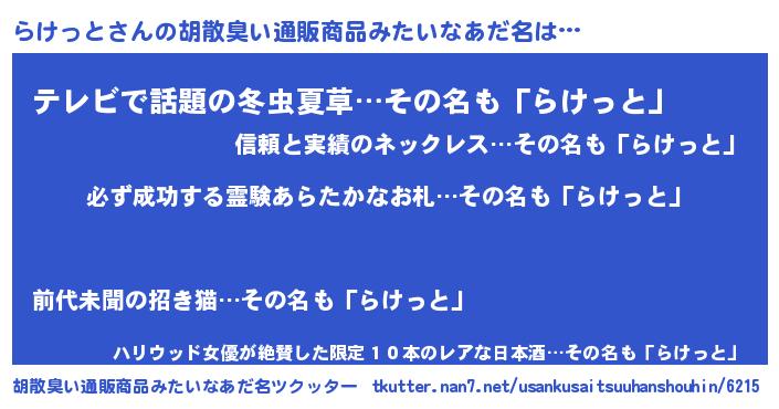 | 男性向けラノベタイトル風あだ名 | 『らけっとの憂鬱』『魔弾の王とらけっと』 |