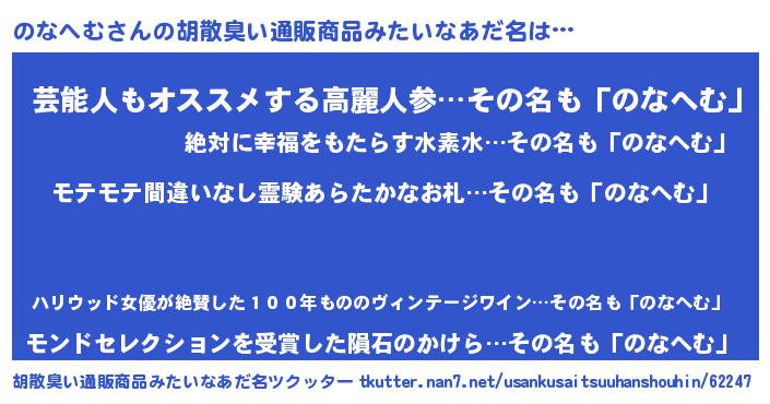 | 男性向けラノベタイトル風あだ名 | 『転生したらのなへむだった件』 |