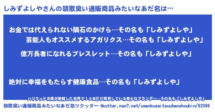 | ヘコむあだ名 | 『しみふぇ~』『しみずよしや(小並感)』 |