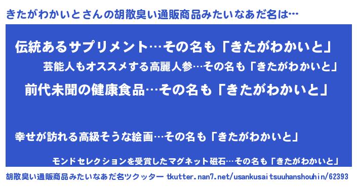 | ヘコむあだ名 | 『きたがわかいと(爆)』『きた太郎』 |