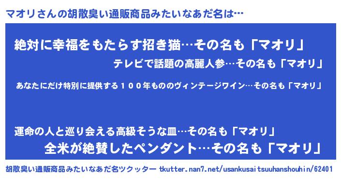| 男性向けラノベタイトル風あだ名 | 『マオリ~年齢イコール彼女いない歴の魔法使い~』 |