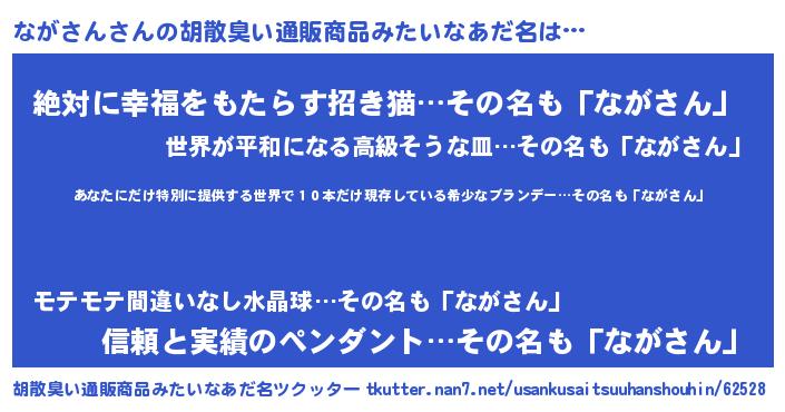 | 男性向けラノベタイトル風あだ名 | 『この素晴らしい世界にながさんを!』 |