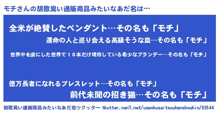 | 意味不明あだ名 | 『住所不定無職モチ(89歳)』『永久保存モチ』 |