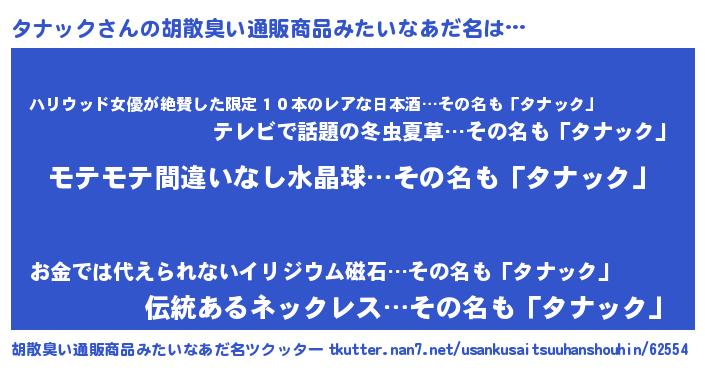 | 男性向けラノベタイトル風あだ名 | 『転生したらタナックだった件』 |