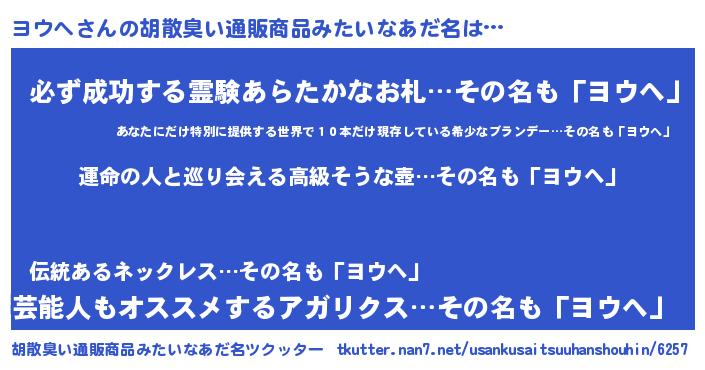 | 男性向けラノベタイトル風あだ名 | 『ヨウヘに滅ぼされるだけの簡単なお仕事です』 |