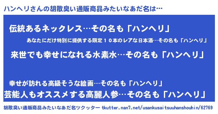 | 意味不明あだ名 | 『永久保存ハンヘリ』『自称ハンヘリ』 |