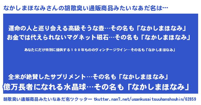 | 意味不明あだ名 | 『住所不定無職なかしまほなみ(1歳)』 |