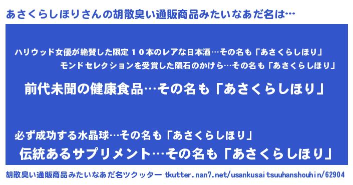 | 意味不明あだ名 | 『永久保存あさくらしほり』 |
