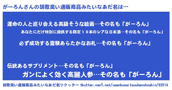 | 男性向けラノベタイトル風あだ名 | 『がーろんの憂鬱』『魔弾の王とがーろん』 |